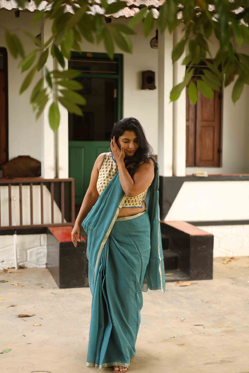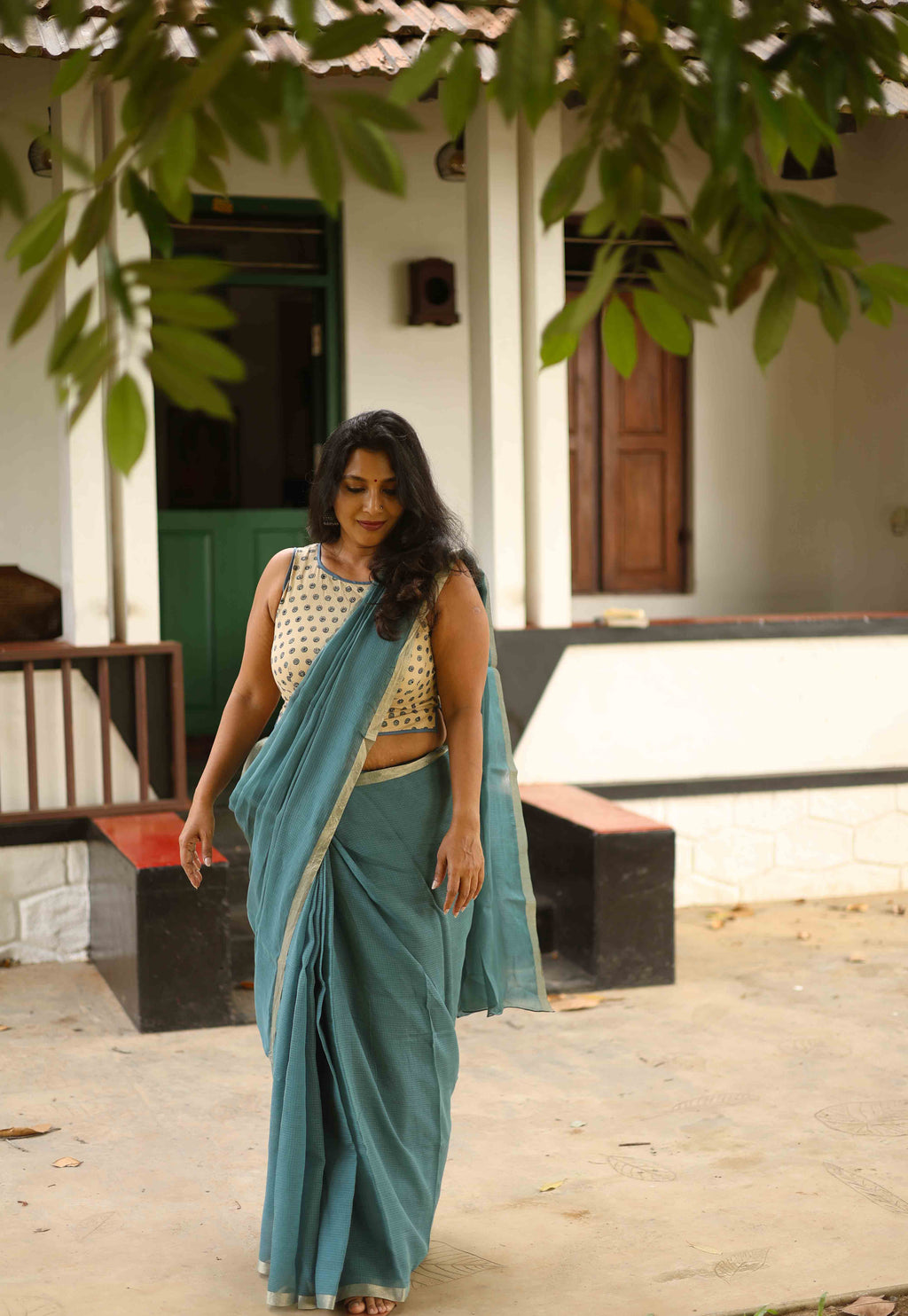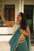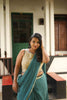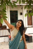 Blue green soft woven Kota saree edged with a Zari border.