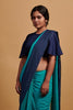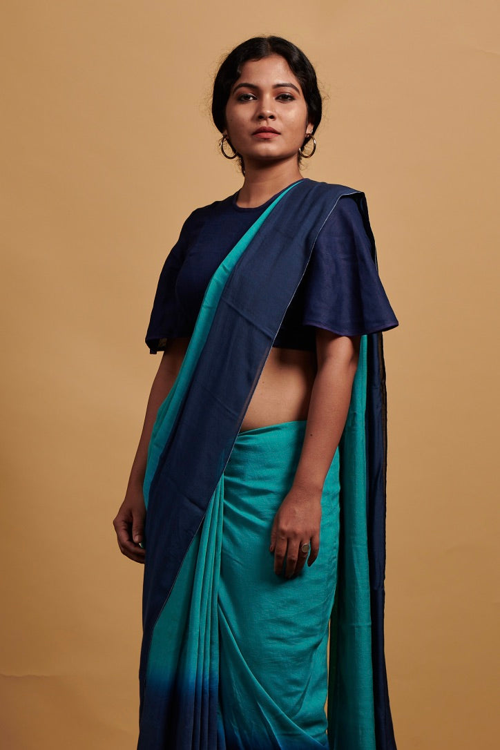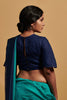 Flamboyant bell sleeves on midnight blue linen blouse with buttons at the back