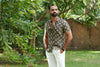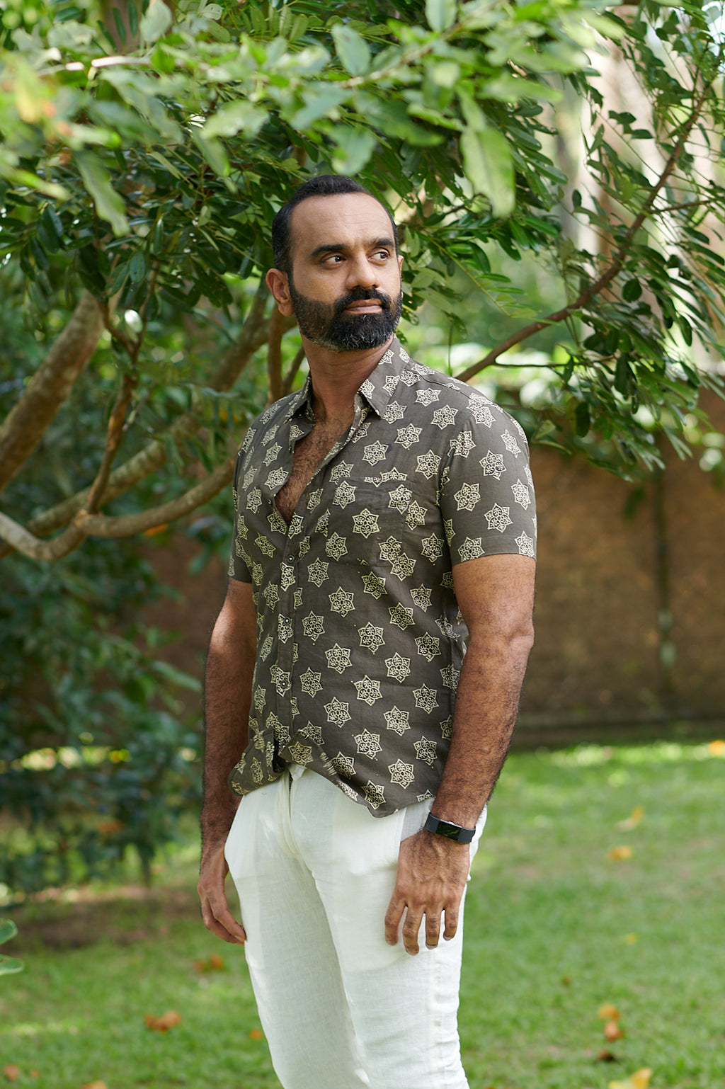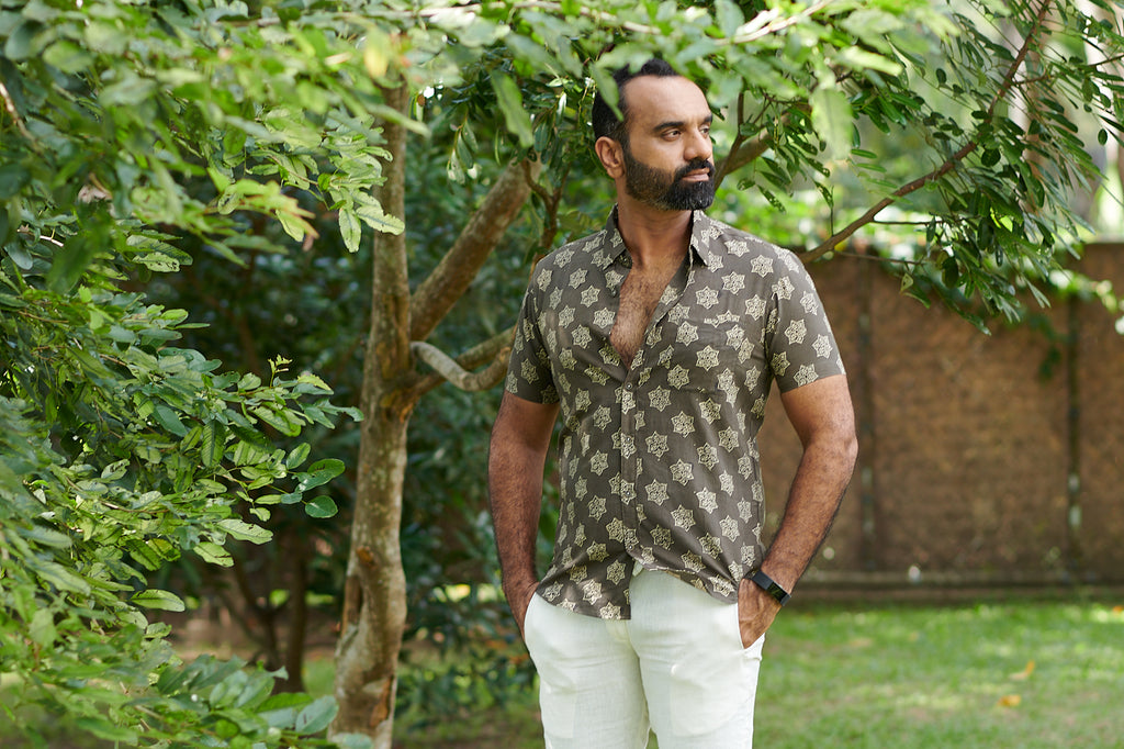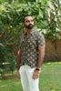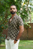 Grey Floral block printed shirt. Pair it with a delicately striped lungi, white pants or black for formal.