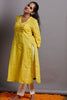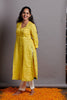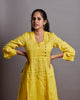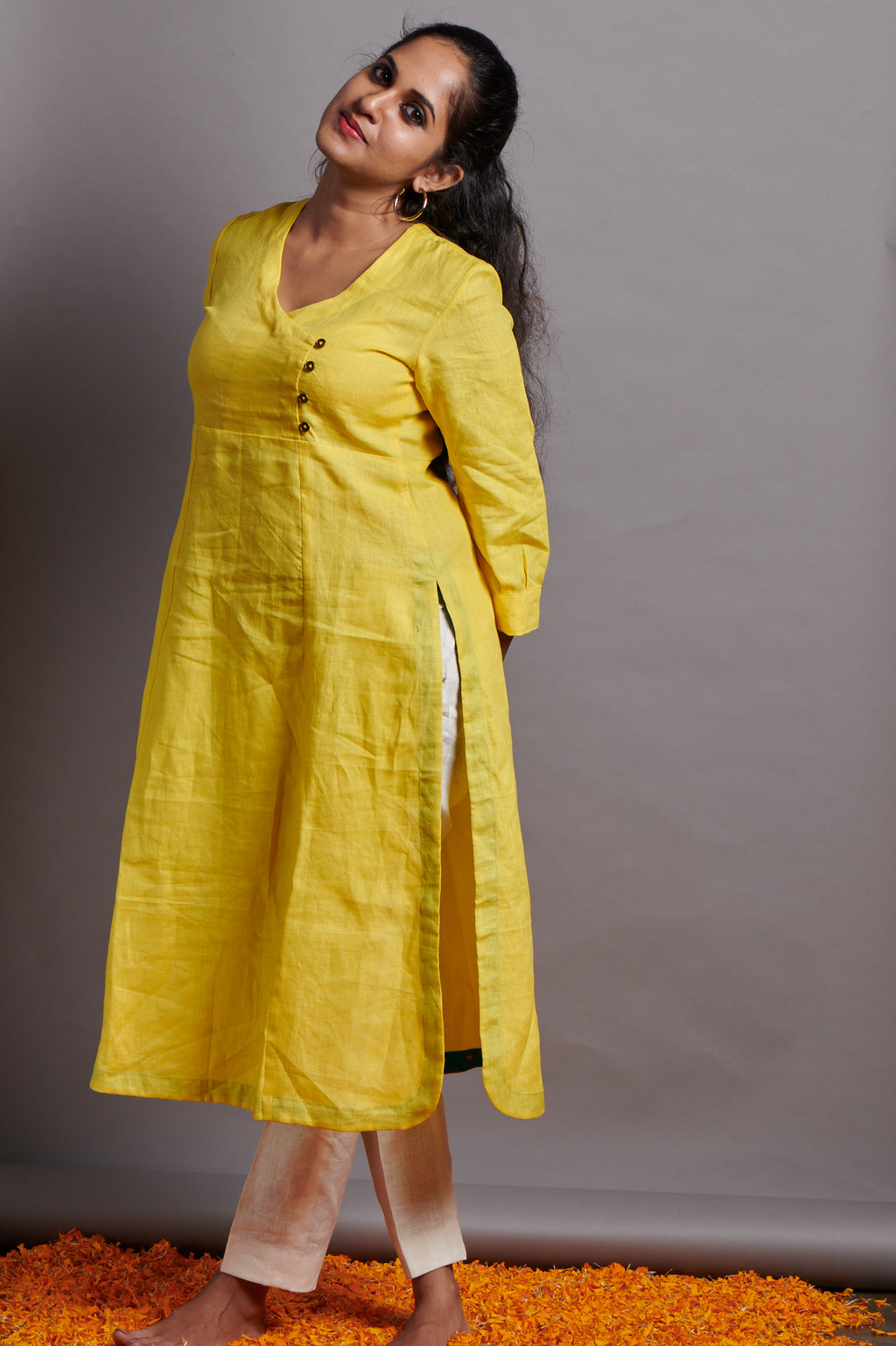 Sunny yellow linen kurta with drop waist, curved hem and button and stitching detail
