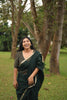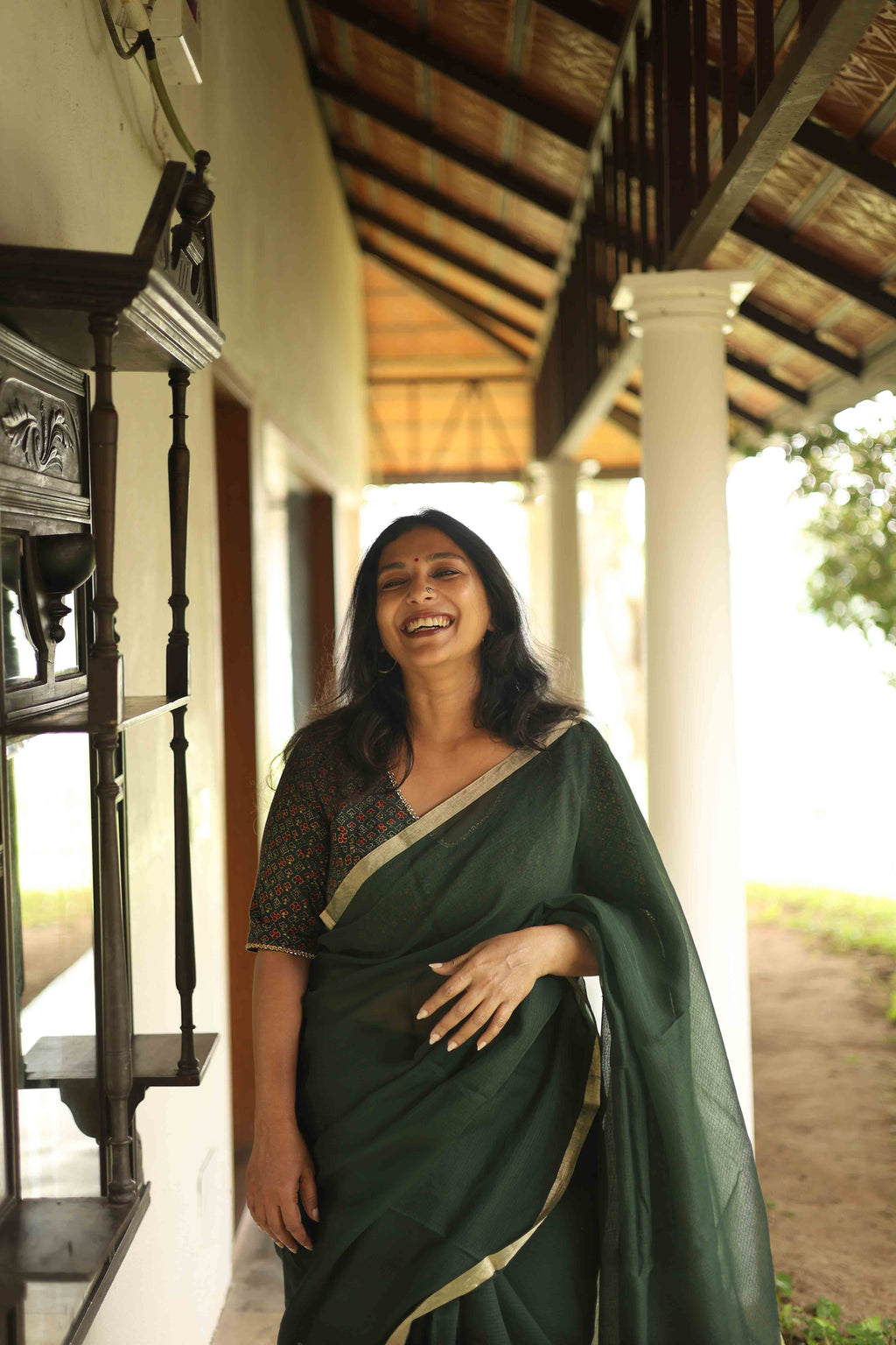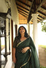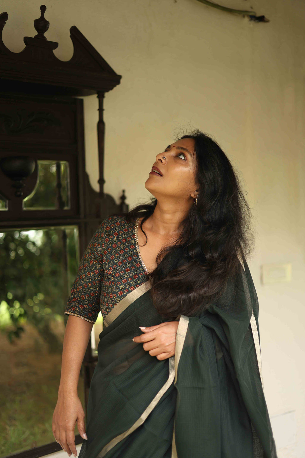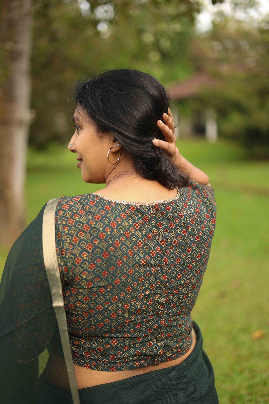 Taash prints on a green base come in this Rajasthani choli inspired blouse with golden Hyderabadi lampi lace piping detail