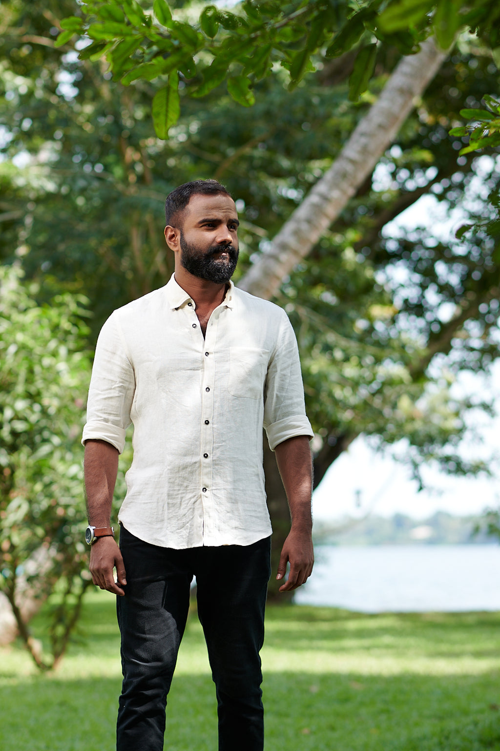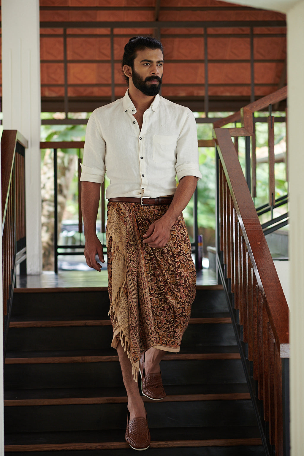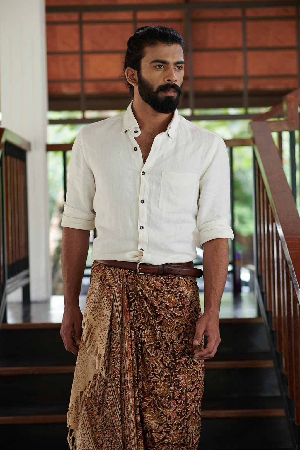 Crisp offwhite full sleeve cotton shirt. Pair it with a delicately striped lungi, khaki pants or black for formal.