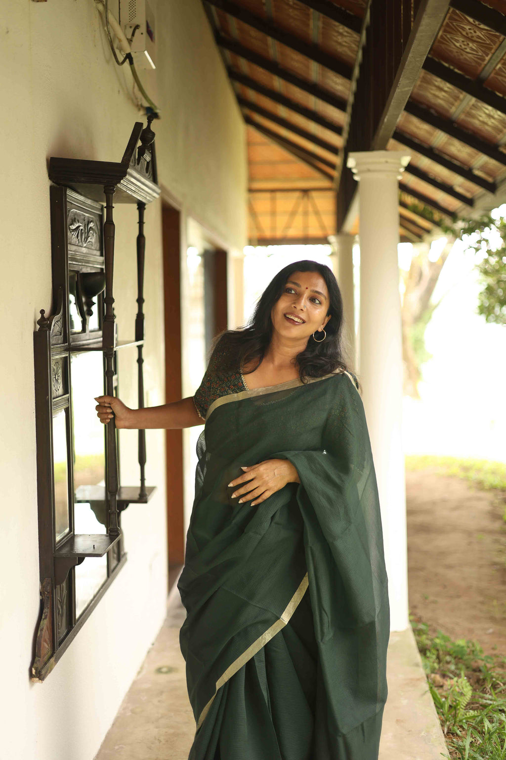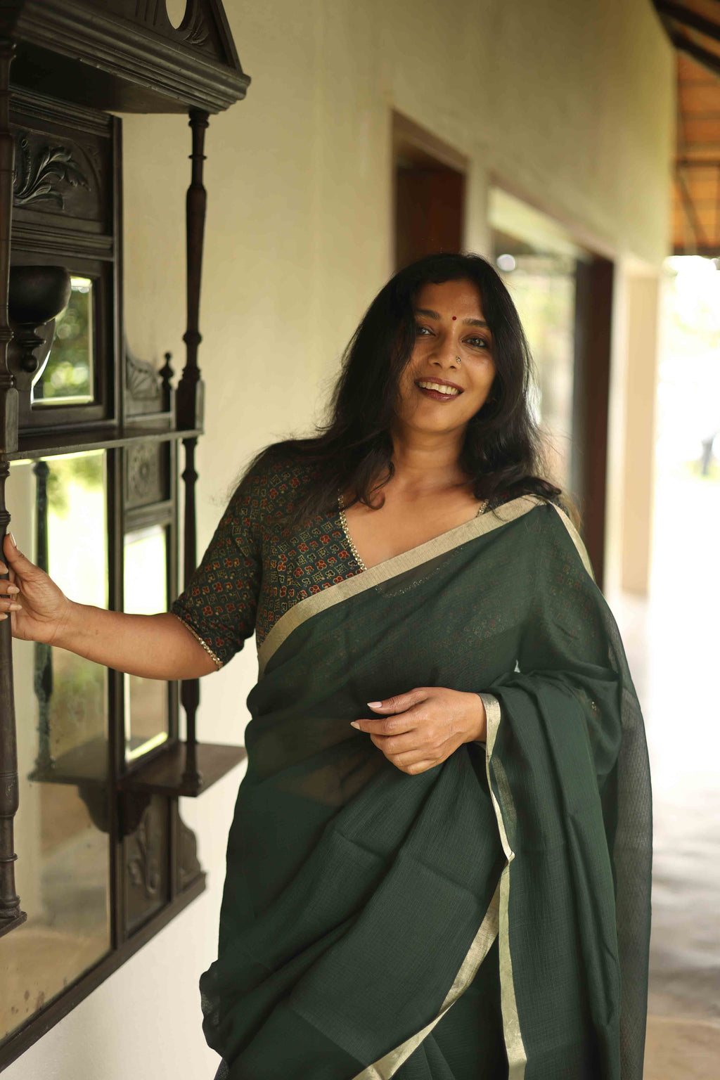 Dark green soft woven Kota saree edged with a Zari border.