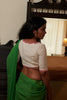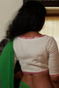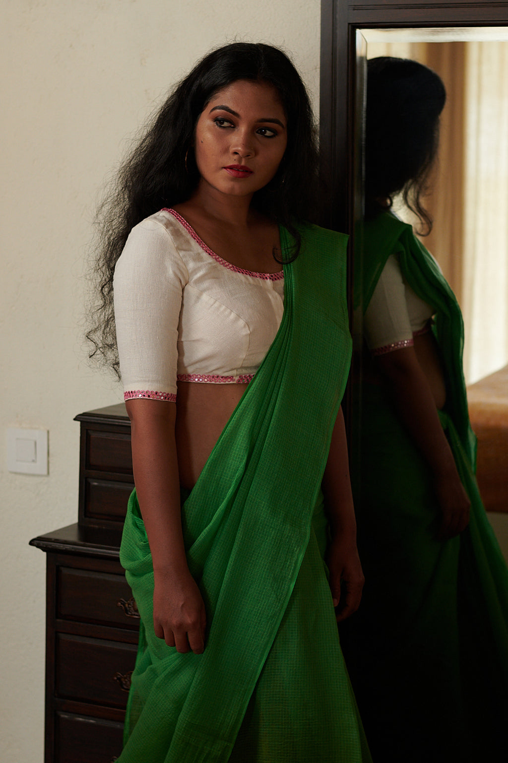 This white cotton blouse is peppered with tiny pink-hued hand embroidered mirror work. Paired here with a parrot green Kota saree.